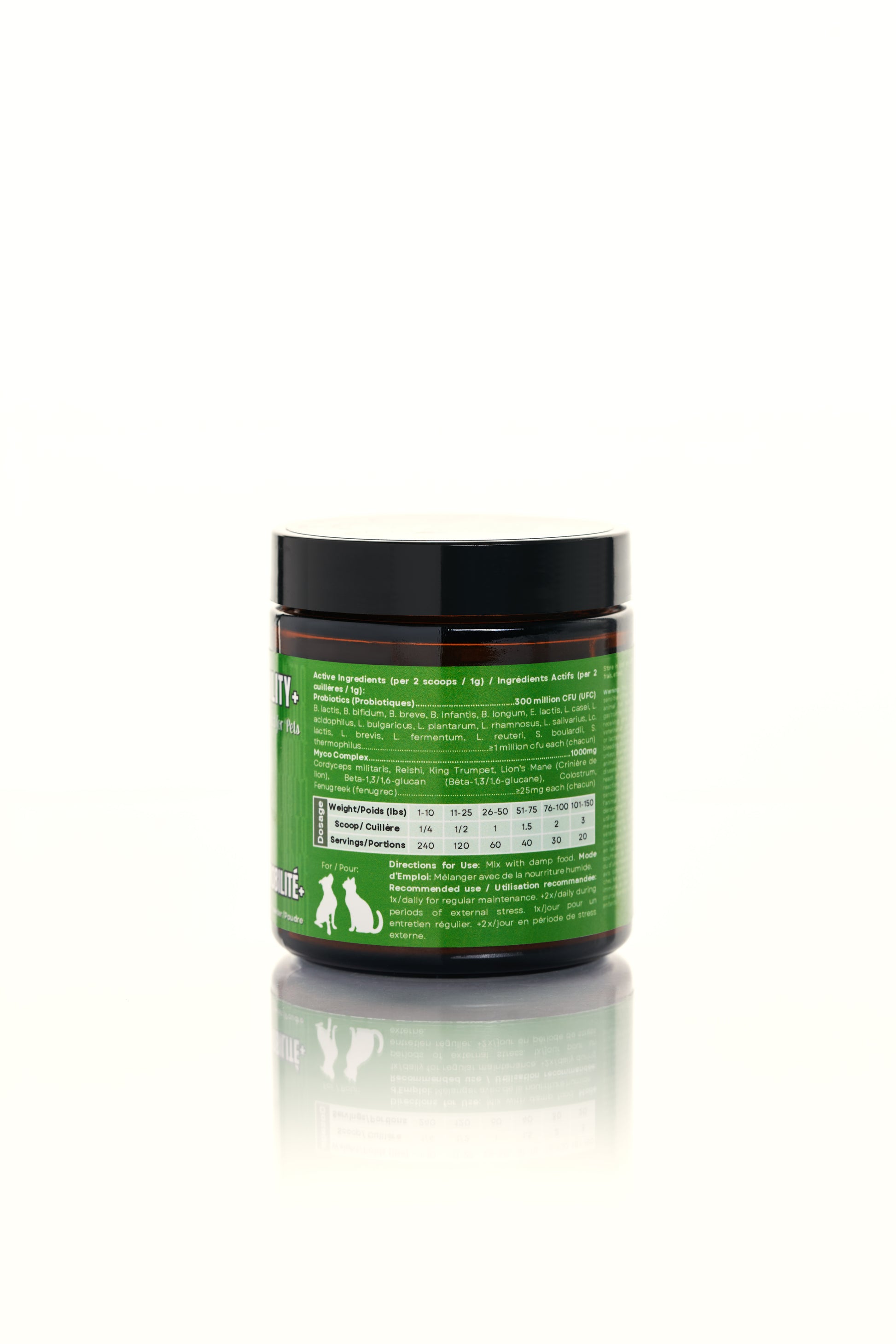INGREDIENTES: Contiene una mezcla patentada de micelio de hongos orgánicos, primordios, cuerpos fructíferos y compuestos extracelulares: Pleurotus eryngi (Trompeta real), Antrodia camphorata, Hericium erinaceus (Melena de león), Ganoderma lucidum (Reishi), Cordyceps sinensis y Cordyceps militaris, derivados de hongos. polisacáridos, calostro bovino, alholva, Bifidobacterium bifidum, Bifidobacterium longum, Enterococcus faecium, Enterococcus thermophilus, Lactobacillus acidophilus, Lactobacillus bulgaricus, Lactobacillus casei, Lactobacillus plantarum.