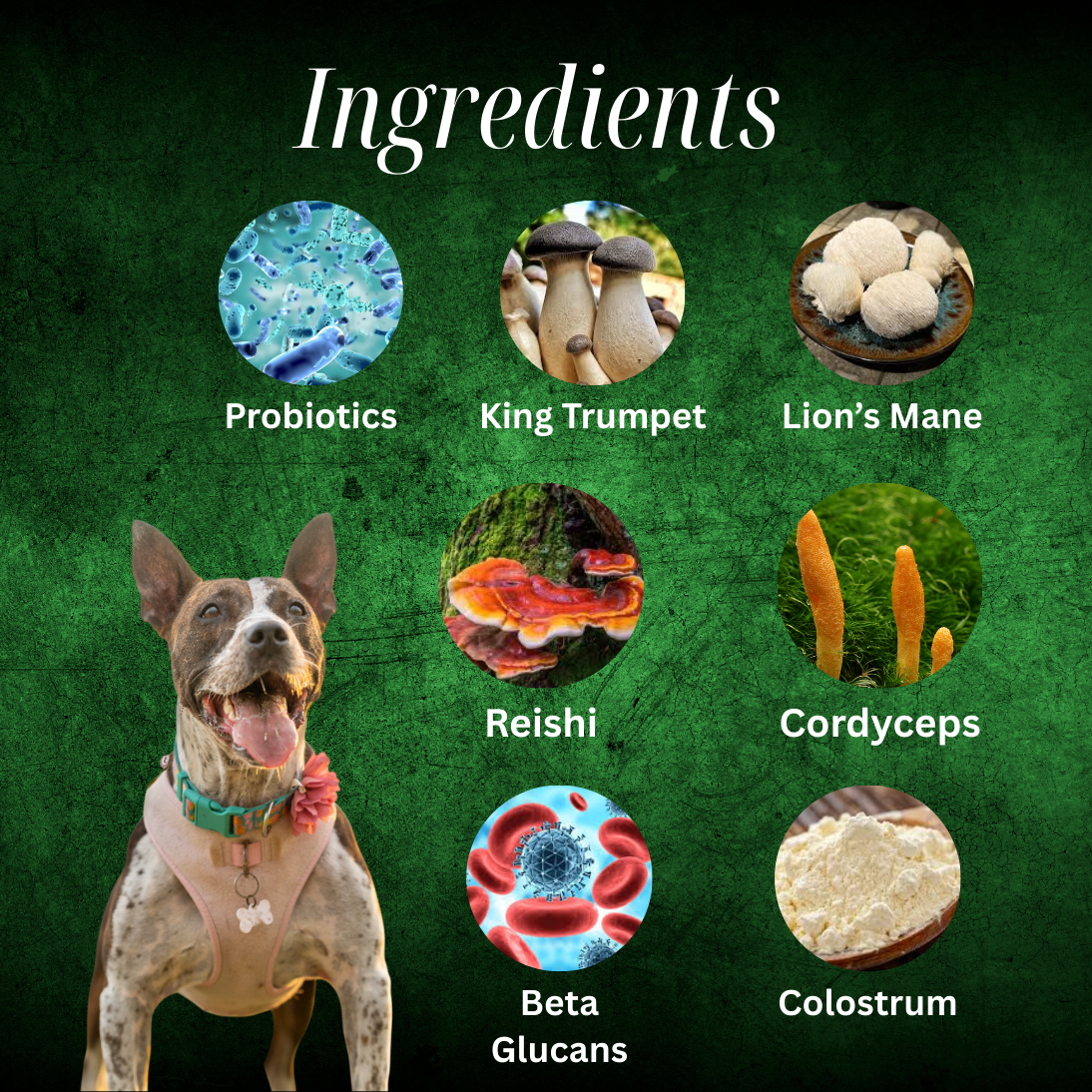 INGRÉDIENTS : Contient un mélange exclusif de mycélium de champignon biologique, d'primordia, de fructifications et de composés extracellulaires : Pleurotus eryngi (trompette royale), Antrodia camphorata, Hericium erinaceus (crinière de lion), Ganoderma lucidum (Reishi), Cordyceps sinensis et Cordyceps militaris, dérivés de champignons. polysaccharides, colostrum bovin, Fenugrec, Bifidobacterium bifidum, Bifidobacterium longum, Enterococcus faecium, Enterococcus thermophilus, Lactobacillus acidophilus, Lactobacillus bulgaricus, Lactobacillus casei, Lactobacillus plantarum.