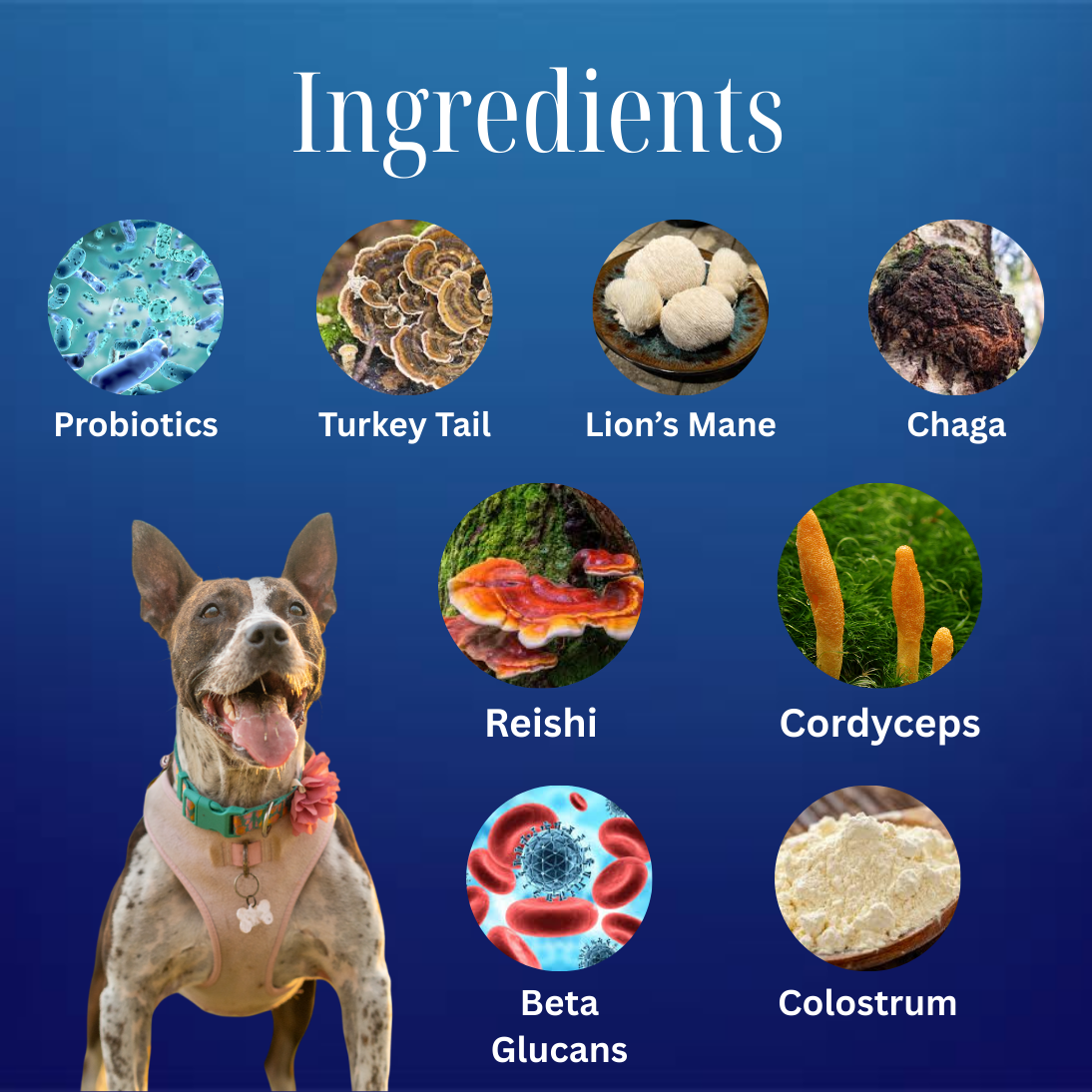 INGRÉDIENTS : Contient un mélange exclusif de mycélium de champignon biologique, de corps fructifères primordiaux et de composés extracellulaires : Cordyceps sinesis, Cordyceps militaris, Canaderma lucidum (Reishi) et Inonotus obliquus (Chaga), Trametes versicolor (queue de dinde), Hericium erinaceus (crinière de lion) , colostrum bovin, fenugrec polysaccharide dérivé de champignons, Bifidobacterium bifidum, Bifidobacterium longum, Enterococcus faecium, Enterococcus thermophilus, Lactobacillus acidophilus, Lactobacillus bulgaricus, Lactobacillus casei et Lactobacillus plantarum.
