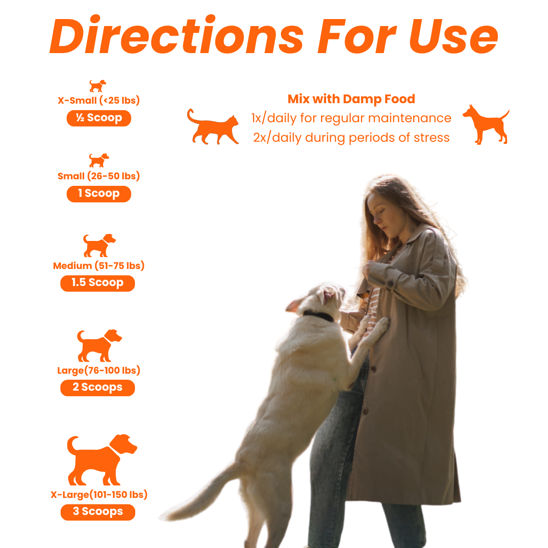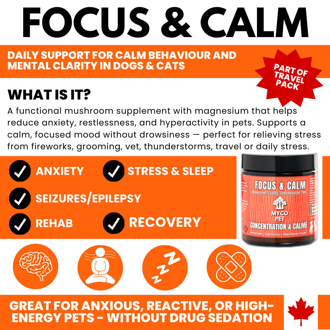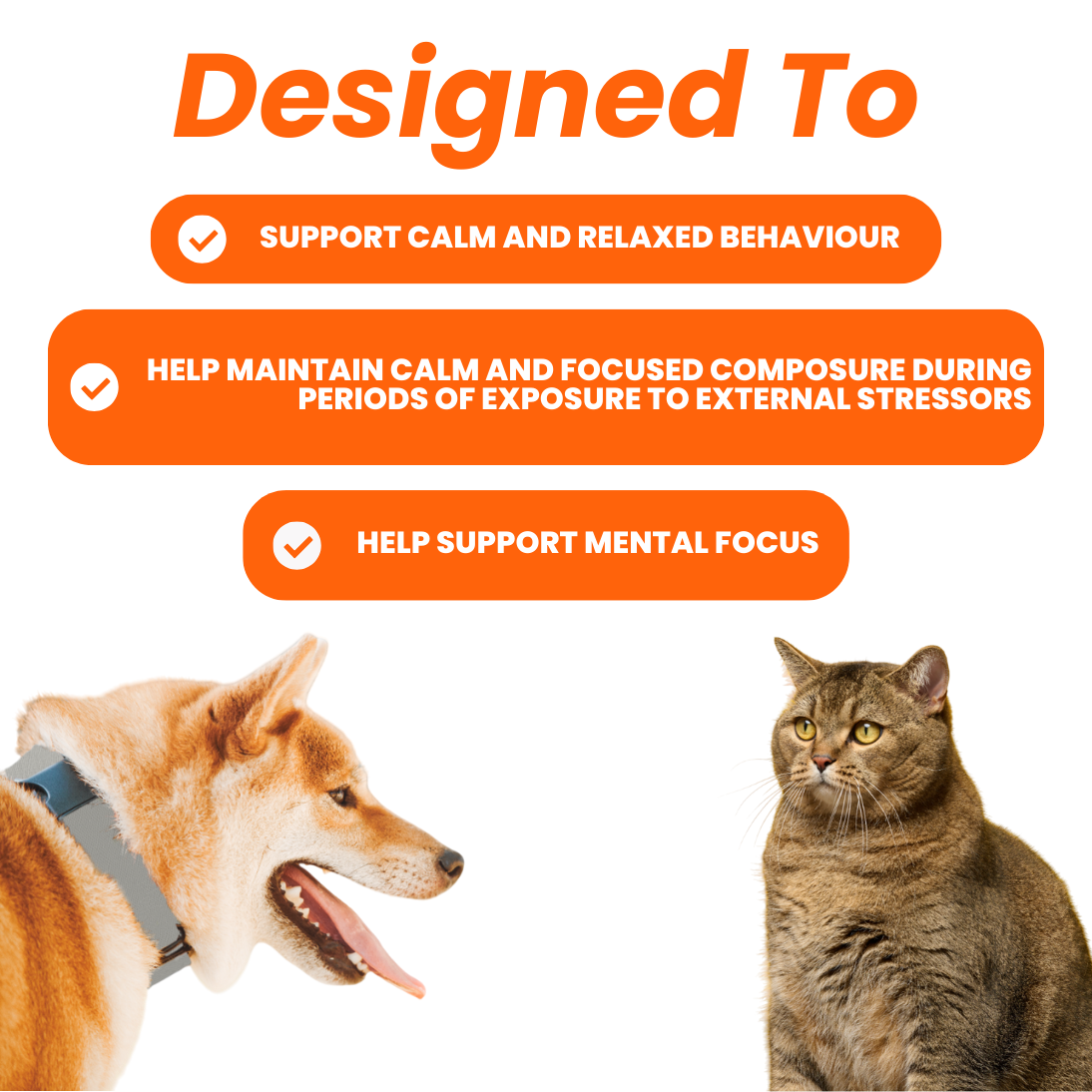 - Helps maintain calm composure during external stressors such as novel or loud sounds like thunderstorms or fireworks, changes in routine or location, unfamiliar visitors, grooming, vet visits, and travel