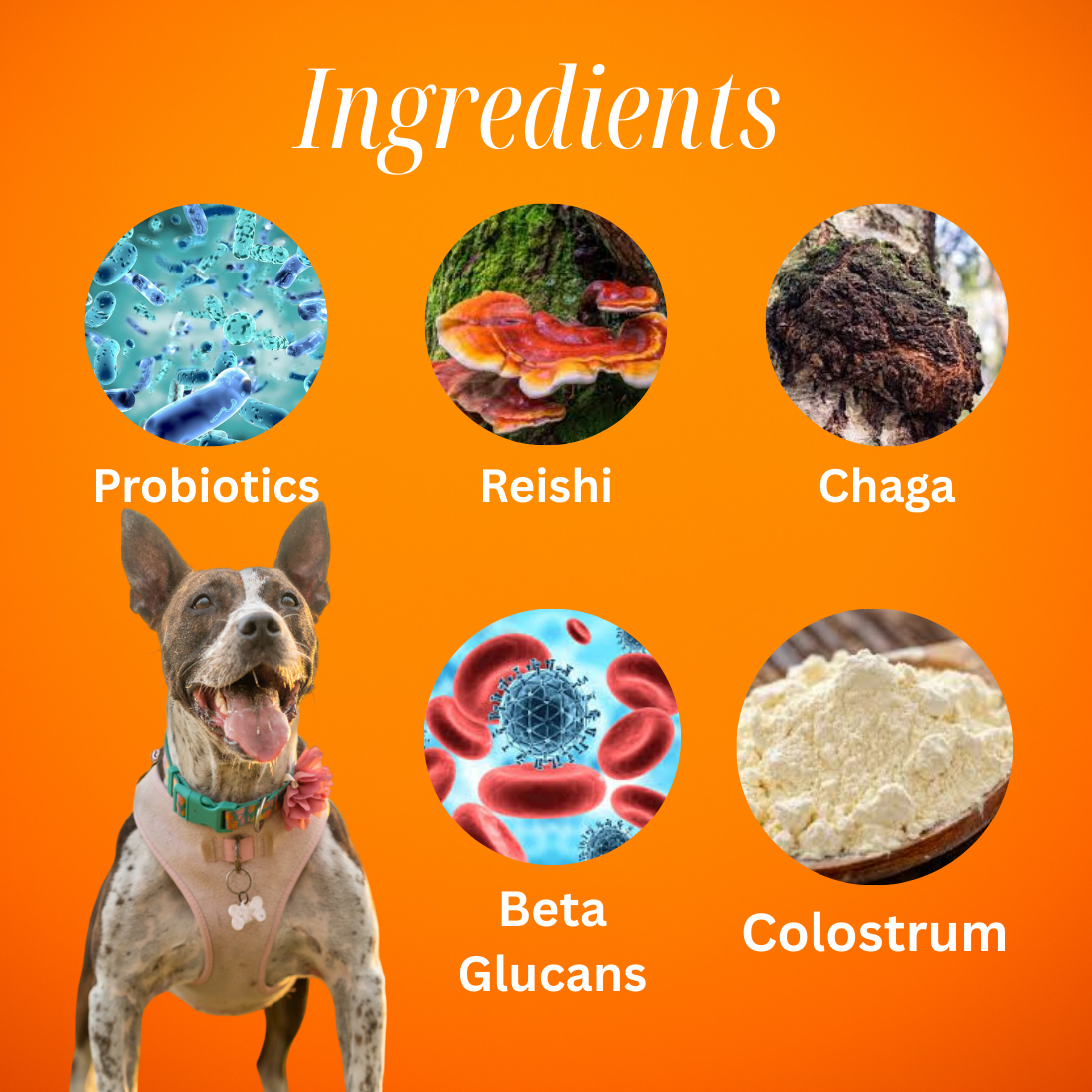 INGRÉDIENTS : Contient un mélange exclusif de mycélium de champignon biologique, de corps fructifères primordiaux et de composés extracellulaires : Cordyceps sinesis, Cordyceps militaris, Canaderma lucidum (Reishi) et Inonotus obliquus (Chaga), Trametes versicolor (queue de dinde), Hericium erinaceus (crinière de lion) , colostrum bovin, fenugrec polysaccharide dérivé de champignons, Bifidobacterium bifidum, Bifidobacterium longum, Enterococcus faecium, Enterococcus thermophilus, Lactobacillus acidophilus, Lactobacillus bulgaricus, Lactobacillus casei et Lactobacillus plantarum.