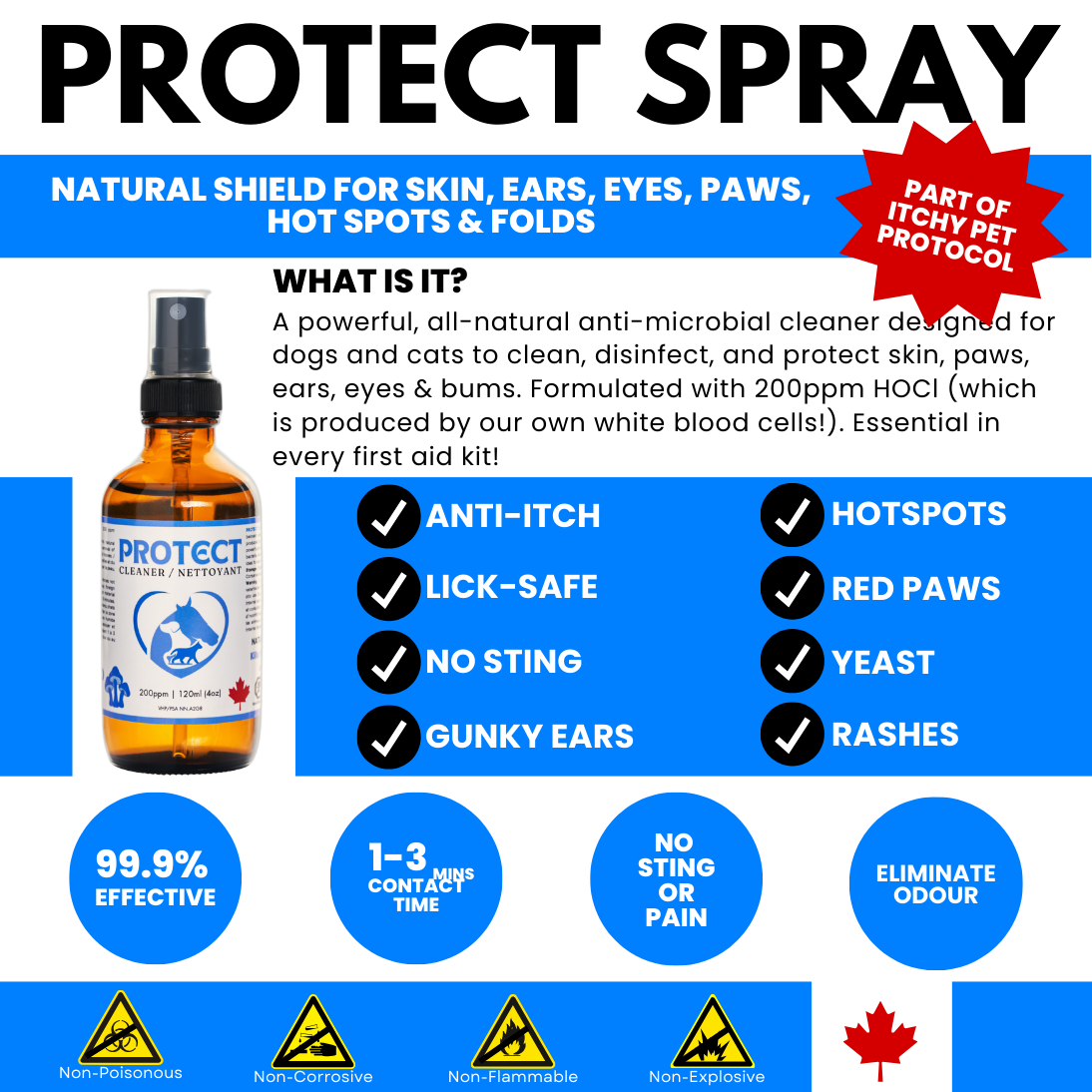 By soothing irritated areas and supporting skin recovery, Protect Spray can help reduce compulsive licking, biting, and scratching — common signs of underlying skin discomfort.