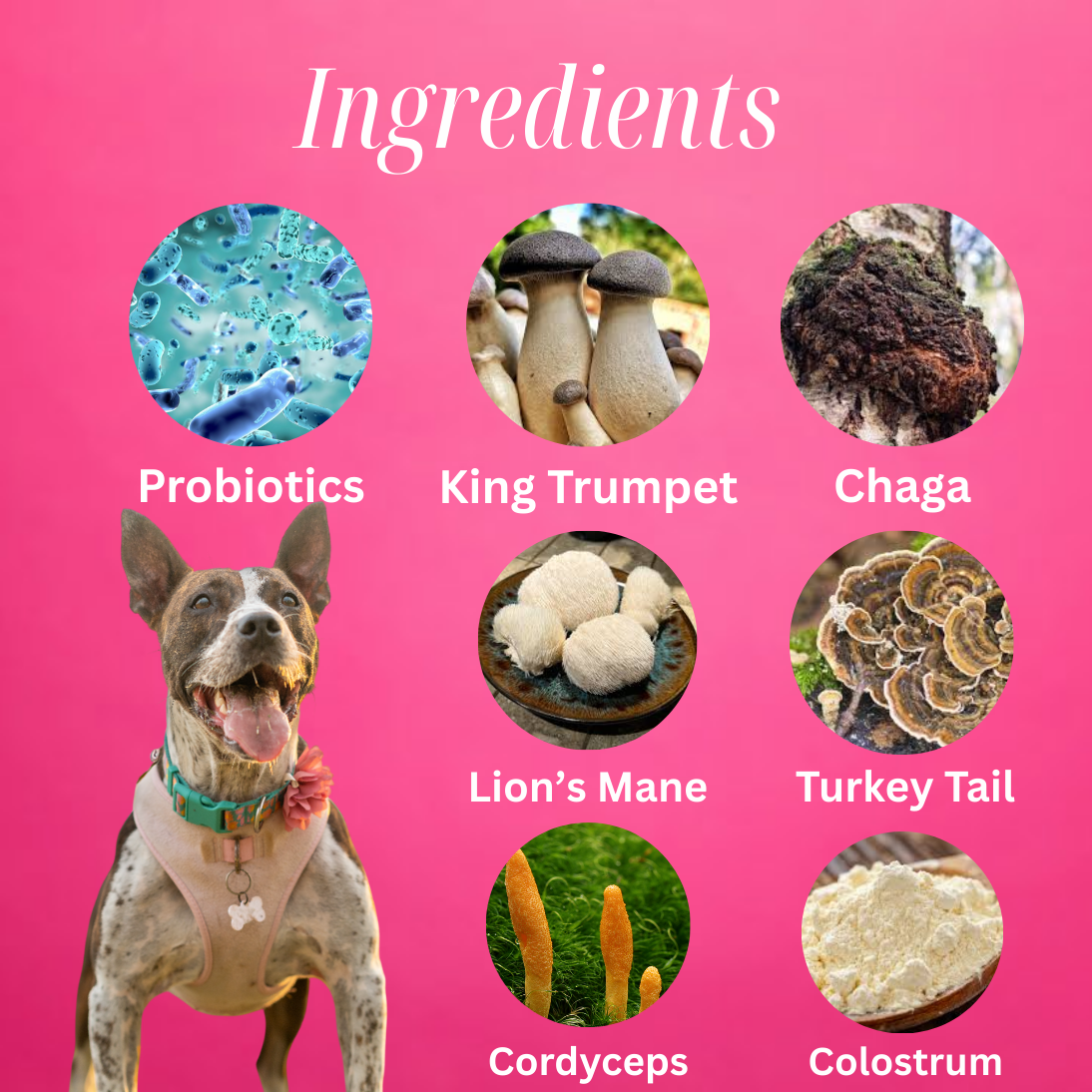 INGRÉDIENTS : Contient un mélange exclusif de colostrum bovin, de mycélium biologique de Ganoderma lucidum (Reishi), d'primordia, de fructifications et de composés extracellulaires, de polysaccharides dérivés de champignons, de fenugrec, de Bifidobacterium bifidum, de Bifidobacterium longum, d'Enterococcus faecium, d'Enterococcus thermophilus, de Lactobacillus acidophilus, de Lactobacillus bulgaricus, Lactobacillus casei et Lactobacillus plantarum.