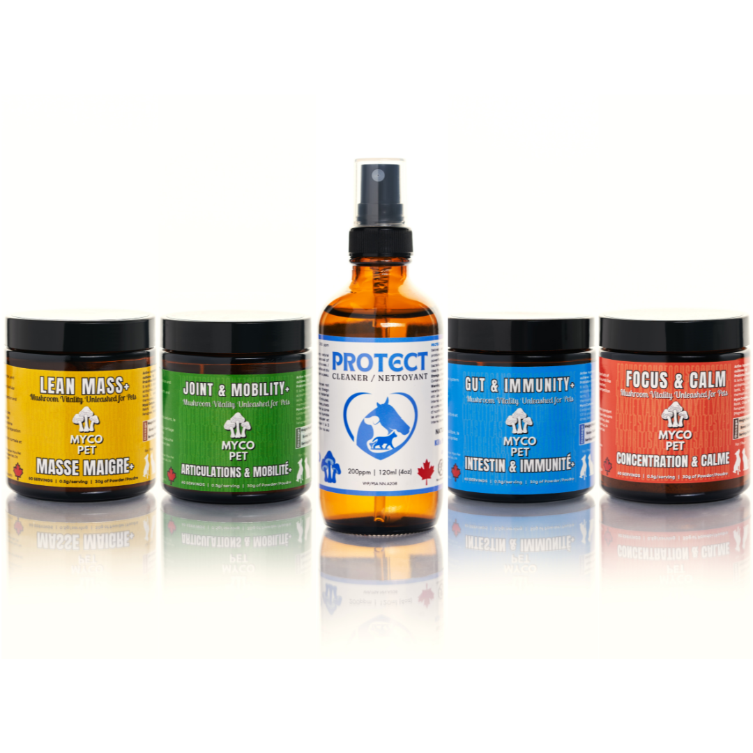 This complete Myco Pet collection combines all five of our science-backed mushroom-powered supplements to support gut health, immunity, joints, focus, muscle recovery, and lifelong vitality in one transformational bundle.