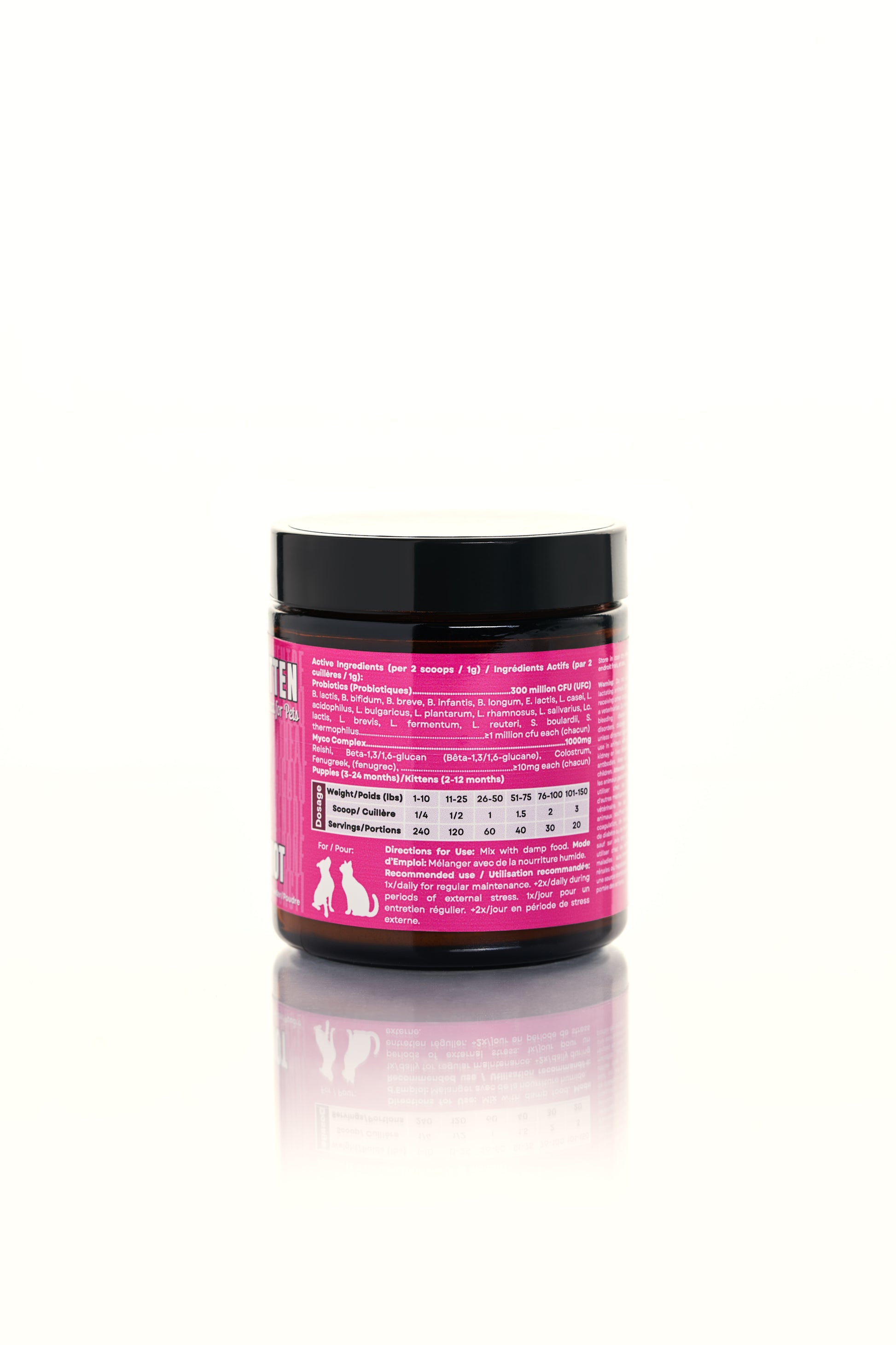 Cordyceps militaris, King Trumpet, Lion’s Mane, Turkey Tail, Chaga, beta-1,3/1,6-glucan, (Crinière de lion, Queue de dinde, Bêta-1,3/1,6-glucane), Colostrum, Fenugreek (fenugrec)..........≥10mg each (chacun)